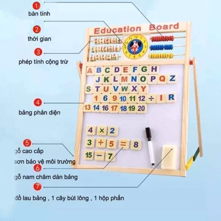 Bảng chữ cái tiếng Việt, số đếm, phép toán đơn giản giúp bé làm quen và ghi nhớ nhanh.