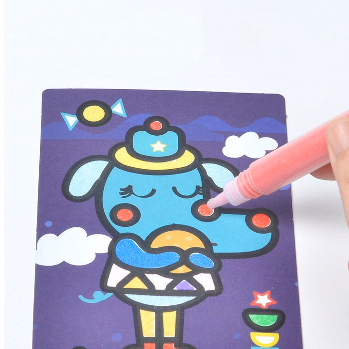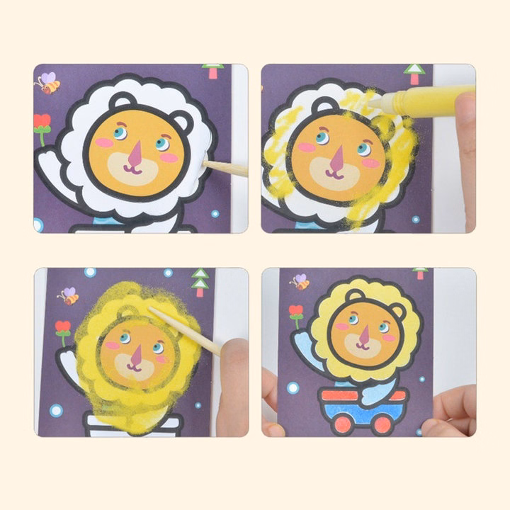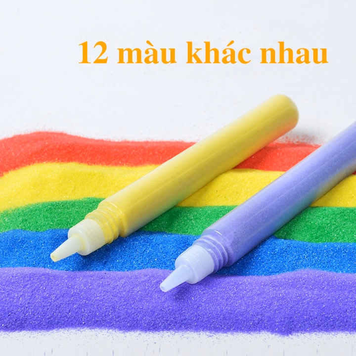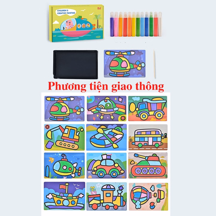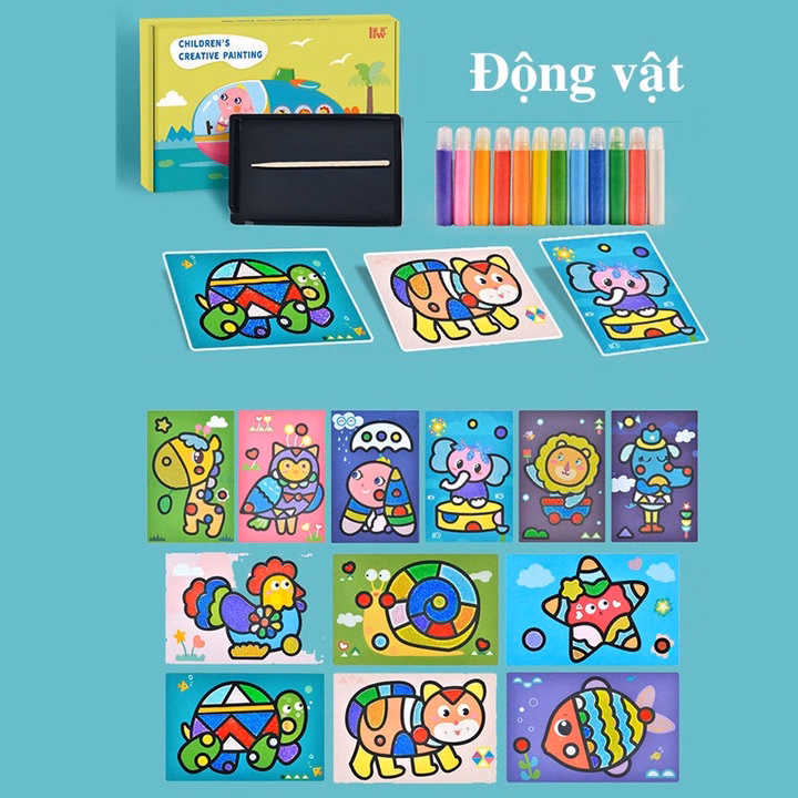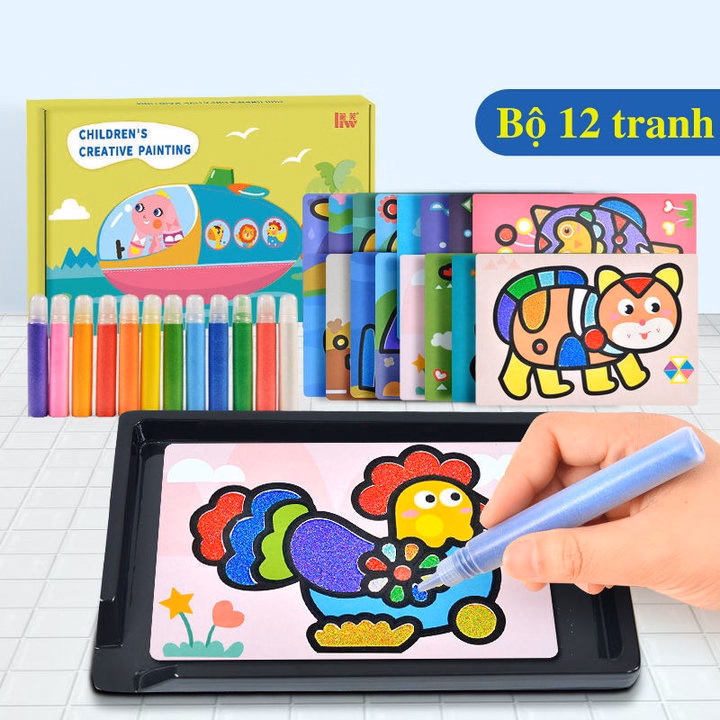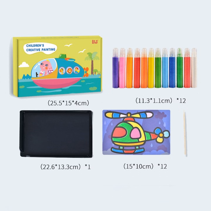 Bộ tranh cát 12 màu cho bé mang đến không gian sáng tạo ngay tại nhà. Với rất nhiều hoa văn từ cỏ hoa cây lá cho đến những hình hoạt hình ngộ nghĩnh, bạn có thể tha hồ kết hợp màu sắc của cát để tạo ra những bức tranh mang đậm phong cách của mình.