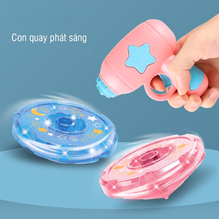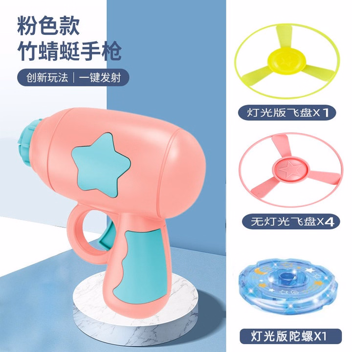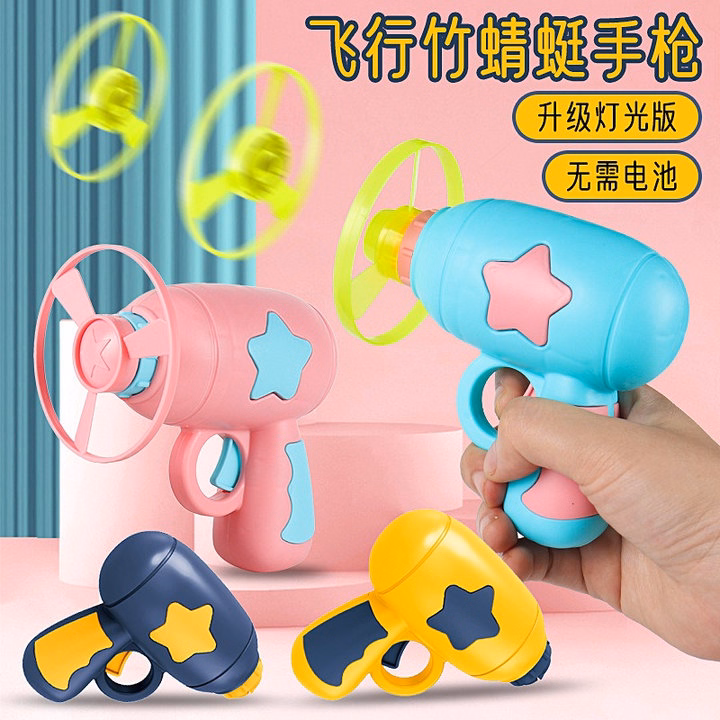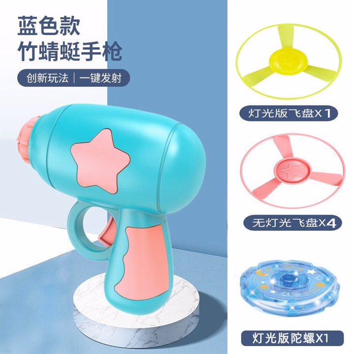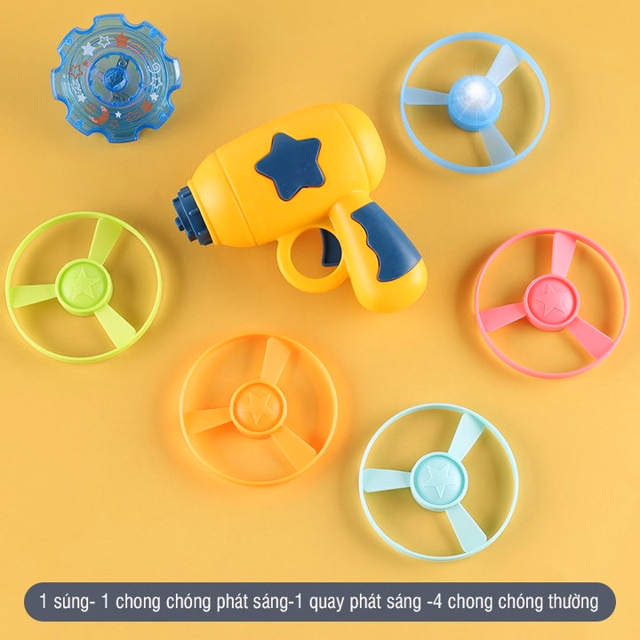 Bộ sản phẩm gồm: 1 súng đồ chơi + 1 chóng chóng phát sáng+ 1 con quay phát sáng + 4 chong chóng thường