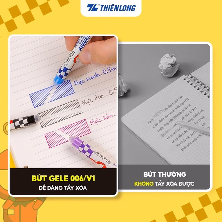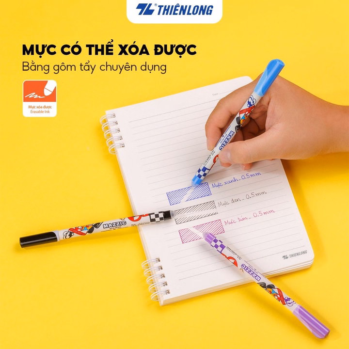 – Mực có thể xóa được bằng gôm tẩy chuyên dụng được tích hợp trên thân bút.